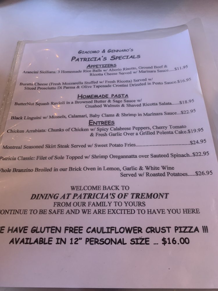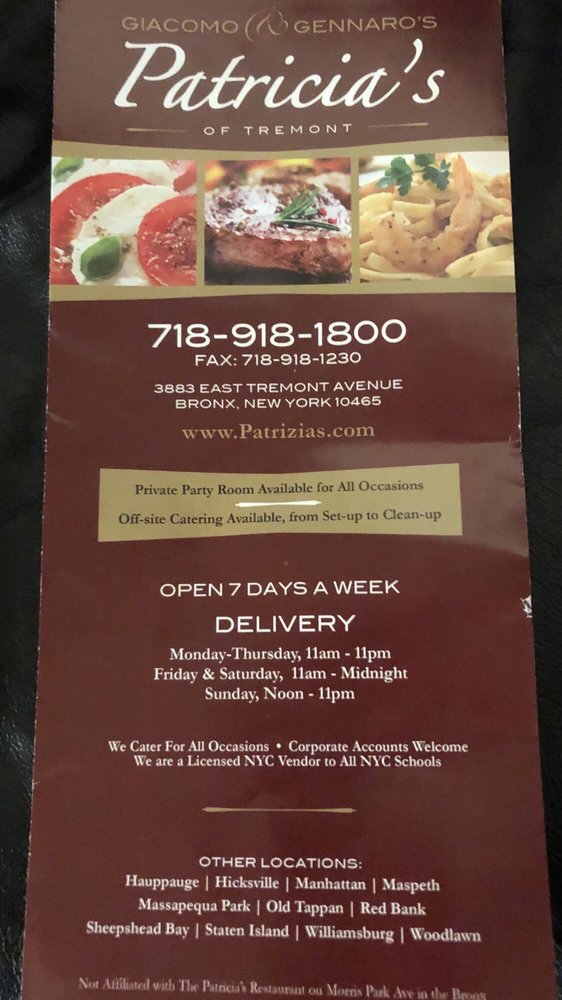 Welcome to Patricia's Of Tremont, a beloved Italian restaurant in Bronx, NY. Offering a wide range of classic Italian dishes, this restaurant is known for its friendly service and delicious food. From hearty antipasto options like Garlic Bread with Melted Mozzarella to mouthwatering main dishes like Fioretti Boscaiola and Chicken Marsala, every dish is made with care and attention to flavor. Customers rave about the generous portions and family-friendly ambiance, making it the perfect spot for a casual meal with loved ones. Don't forget to try their house wines and desserts like Zeppoles for a complete dining experience. Whether you're looking for a cozy dinner or a large gathering, Patricia's Of Tremont is sure to impress with its authentic Italian cuisine and welcoming atmosphere.